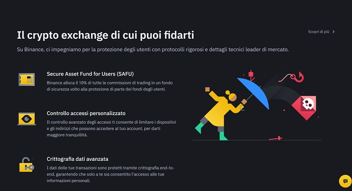 Binance è un exchange di criptovaluta considerato affidabile. In che senso? Nel senso che ha adottato alcune delle migliori pratiche e protocolli di sicurezza attualmente disponibili sul mercato. Ad esempio, le sue piattaforme e il suo sito web sono protetti da crittografia all'avanguardia e moderni sistemi di protezione adottati dalle grandi aziende del settore finanziario.
