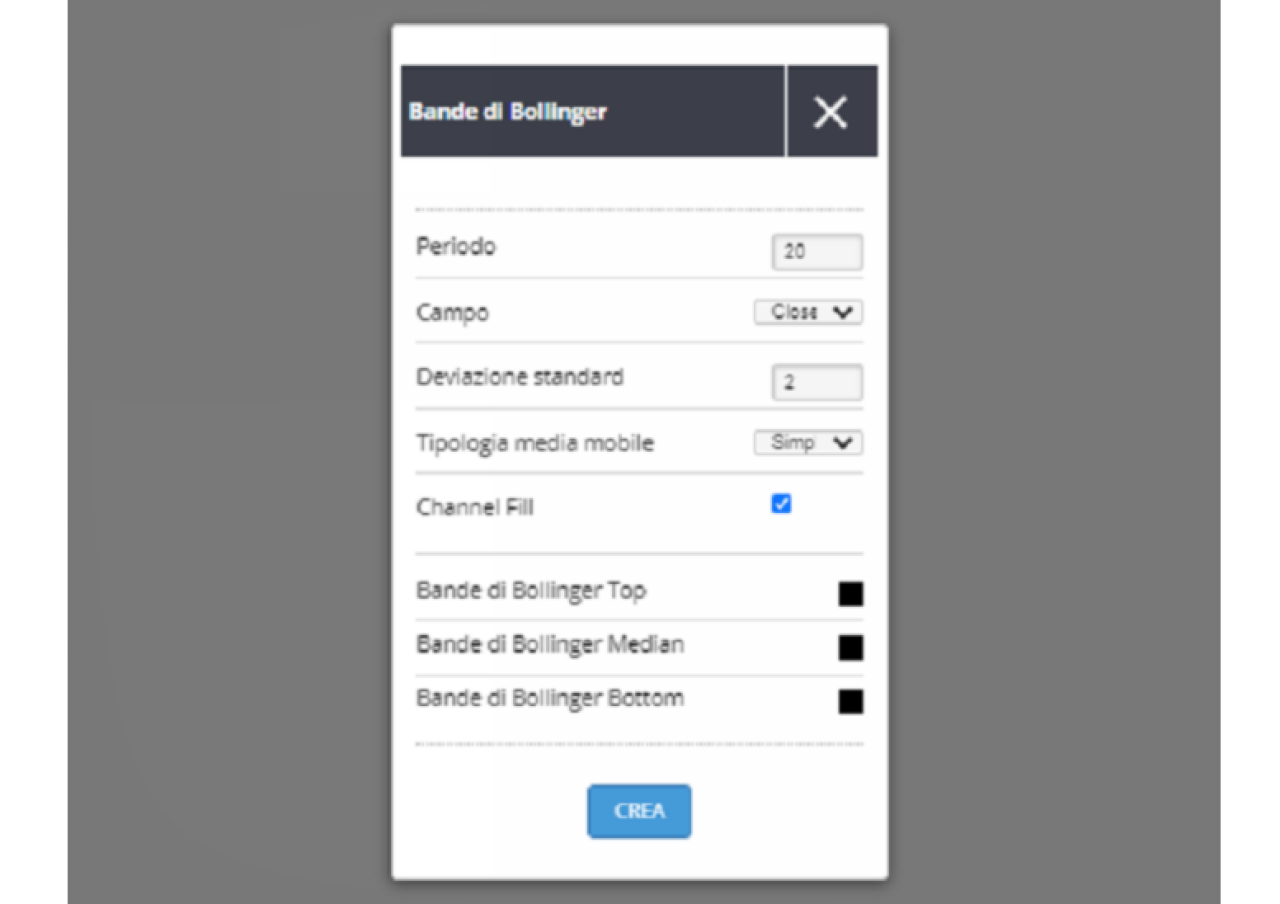 Banda superiore = Banda centrale + 2 * std ( SMA(20)). Si somma 2 volte la deviazione standard calcolata sulla Banda centrale come media semplice a 20 periodi.
