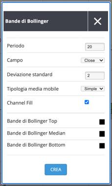 Cliccando sulle barre verticali subito dopo la ruota dentata (impostazioni del grafico) appaiono tutti gli indicatori presenti sulla piattaforma tra gli altri anche il famoso strumento, indicatore “Bande di Bollinger”, che permette di visualizzare graficamente le aree di ipervenduto e ipercomprato dell’asset, ma non solo, indicano l'aumento e diminuzione della volatilità e possibili cambi di tendenza: