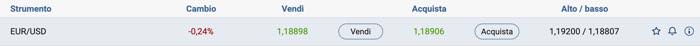 Per decidere in che direzione entrare in mercato bisogna analizzare l’andamento del prezzo. Dopo aver selezionato la categorie e l’asset specifico da analizzare, si potrà aprire il grafico del prezzo. Andando ad esempio nella categoria Forex e cliccando su Principali, ti apparirà la seguente schermata. Ogni barra riporta il prezzo dell’asset il cambio e il prezzo in acquisto e in vendita in quel preciso momento. Potrai acquistare o vendere cliccando direttamente sui pulsanti presenti in questa barra: